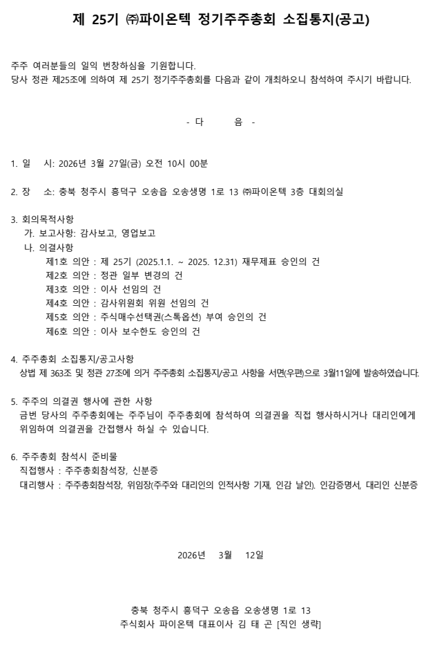 제 25기 ㈜파이온텍 정기주주총회 소집통지(공고) (2026.03.12)